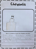 Also, when we came to school Monday we noticed that our caterpillars had made a chrysalis over the weekend! The students observed what they noticed and then I moved the lid of the cup to our butterfly house so they would have more room when they came out.